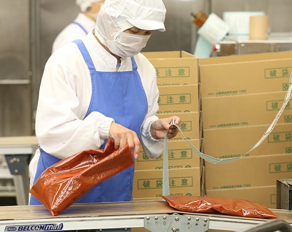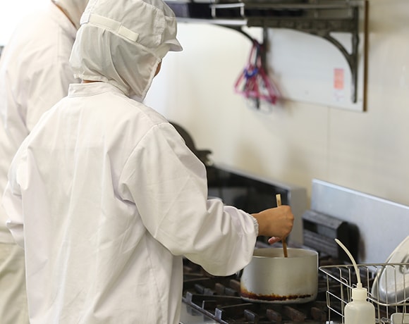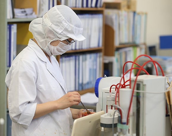 同じ品質の商品を製造するために、前処理から箱詰めまですべての工程において品質管理を行っています。具体的には、例えば同じレシピ通りに作っても検査をすると値が違ってしまうことがあります。そんな時はその製品で決められた規格の値以内に収まるように現場へ指示をします。また細菌検査を毎日することで食中毒などを防ぐようにしたり、従業員への衛生教育も品質管理部の仕事です。